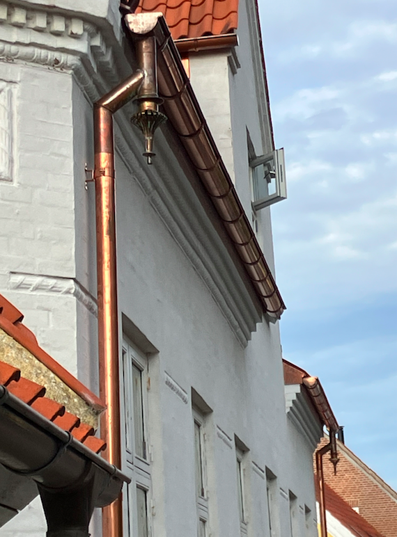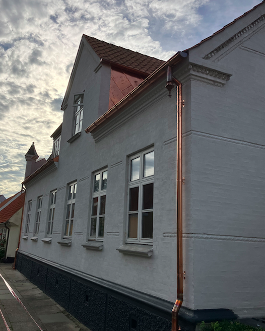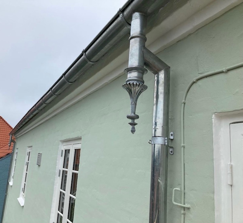 Nye tagrender med drueknæ på nedløbsrørene er blevet sat op på Fuglsangsgade i Mariager.
