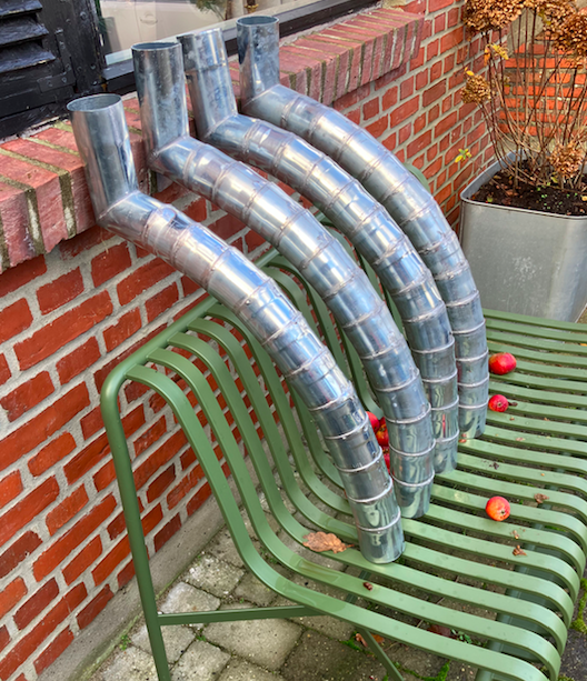 Disse nedløbsrør kaldes drueknæ, fremstillet på værkstedet med fantasi og dele fra p-hætte, rørholder og et fiske-lod.